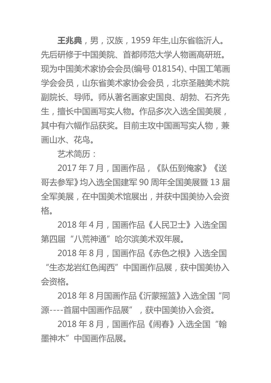 王兆典,男,汉族,1959年生,东省临沂人。先后研修于中国美院、首都师范大学人物画高研班。现为中国美术家协会会员(编号018154)、中国工笔画学会会员,山东省美术家协会会员。师从著名画家史国良、胡勃、石齐先生,擅长中国画写实人物。作品多次入选全国美展,其中有六幅作品获奖。目前主攻中国画写实人物,兼画山水、花鸟。