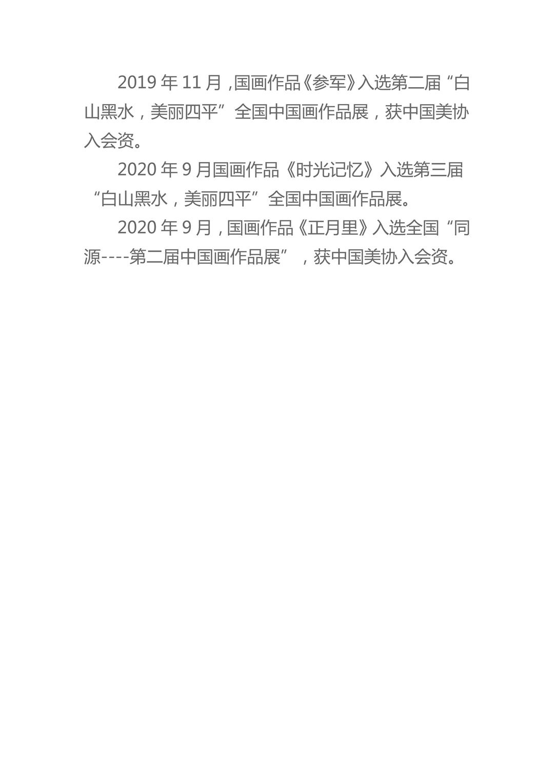2019年11月,国画作品《参军》入选第二届“白山黑水,美丽四平”全国中国画作品展,获中国美协入会资。